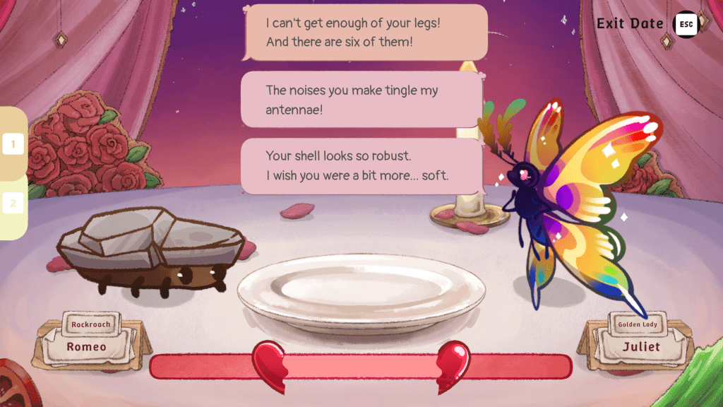You will be able to add objects to increase the odds of the date succeeding such as branches, rocks, moss or flowers. Each bug will have different preferences that you will need to adapt to.