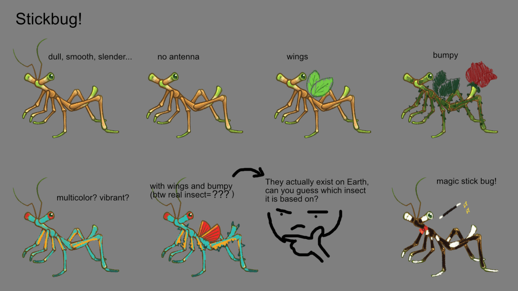 The real world counterpart for the blue winged stick bug is the “Metallic Stick Insect” (Achrioptera fallax). It looks so cool that it didn’t need that much tweaking to fit in the game.